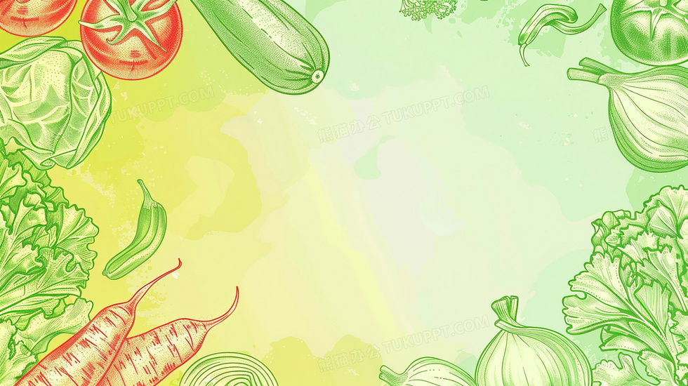 本作品内容为蔬菜简约装饰边框背景, 格式为 jpg, 大小3 MB, 图片尺寸为2912 x 1632, 作品中背景图片无需修改, 源文件无水印,可以直接使用, 欢迎使用熊猫办公。 如认为平台内容涉嫌侵权,可通过邮件:tousu@tukuppt.com提出书面通知,我们将及时处理。