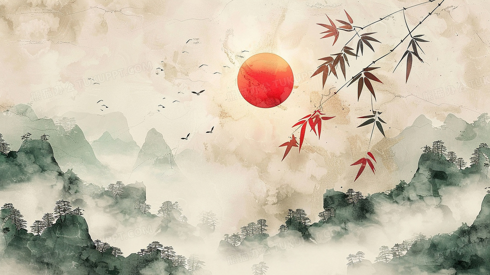 本作品内容为红日中国风山水水墨风景背景, 格式为 jpg, 大小4 MB, 图片尺寸为2912 x 1632, 作品中背景图片无需修改, 源文件无水印,可以直接使用, 欢迎使用熊猫办公。 如认为平台内容涉嫌侵权,可通过邮件:tousu@tukuppt.com提出书面通知,我们将及时处理。