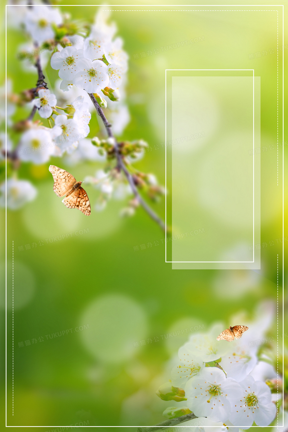 本作品内容为春季春分二十四节气绿色小清新开花蝴蝶背景, 格式为 psd, 大小85 MB, 图片尺寸为3543 x 5315, 作品中背景图片无需修改, 源文件无水印,可以直接使用, 欢迎使用熊猫办公。 如认为平台内容涉嫌侵权,可通过邮件:tousu@tukuppt.com提出书面通知,我们将及时处理。