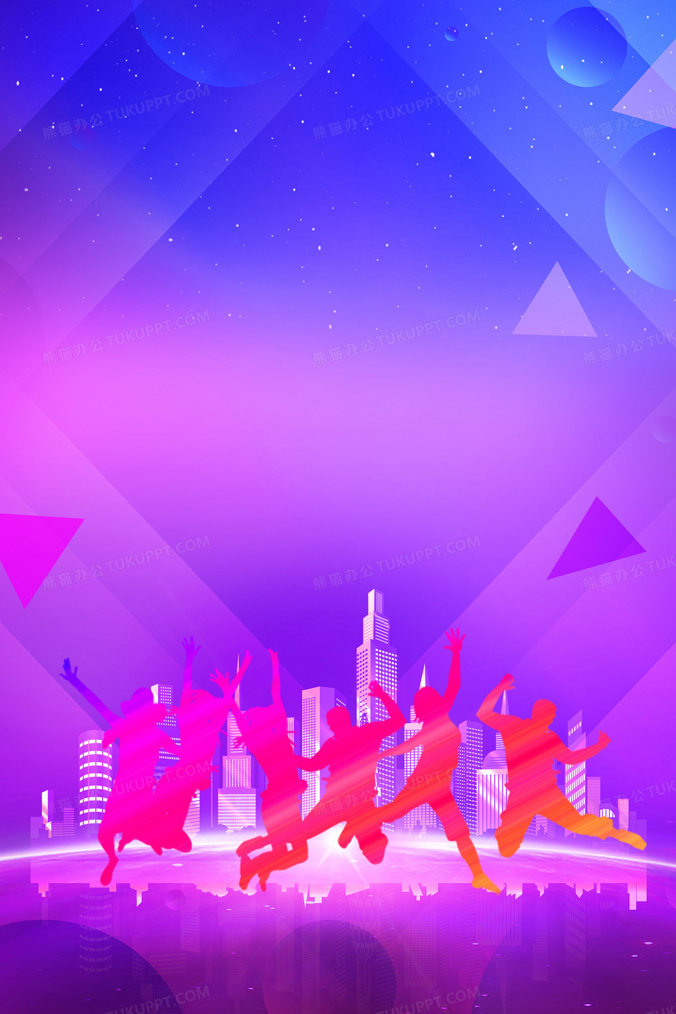 本作品内容为青年节渐变城市青春剪影背景, 格式为 psd, 大小94 MB, 图片尺寸为3543 x 5315, 作品中背景图片无需修改, 源文件无水印,可以直接使用, 欢迎使用熊猫办公。 如认为平台内容涉嫌侵权,可通过邮件:tousu@tukuppt.com提出书面通知,我们将及时处理。