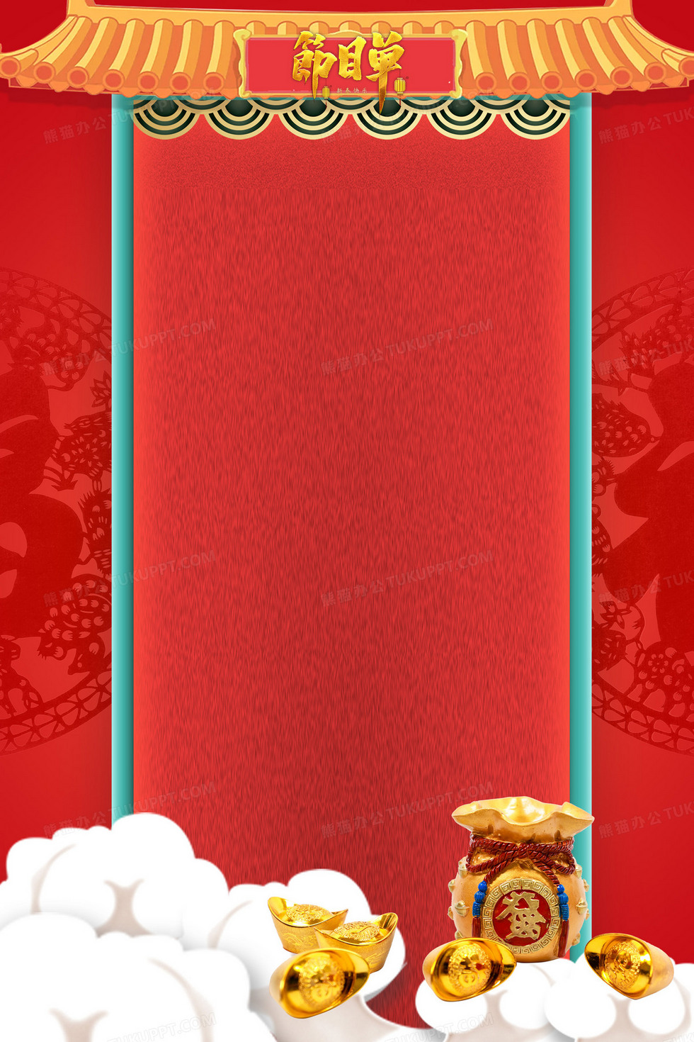 本作品内容为红色大气简约新年节目单背景, 格式为 psd, 大小41 MB, 图片尺寸为2362 x 3543, 作品中背景图片无需修改, 源文件无水印,可以直接使用, 欢迎使用熊猫办公。 如认为平台内容涉嫌侵权,可通过邮件:tousu@tukuppt.com提出书面通知,我们将及时处理。
