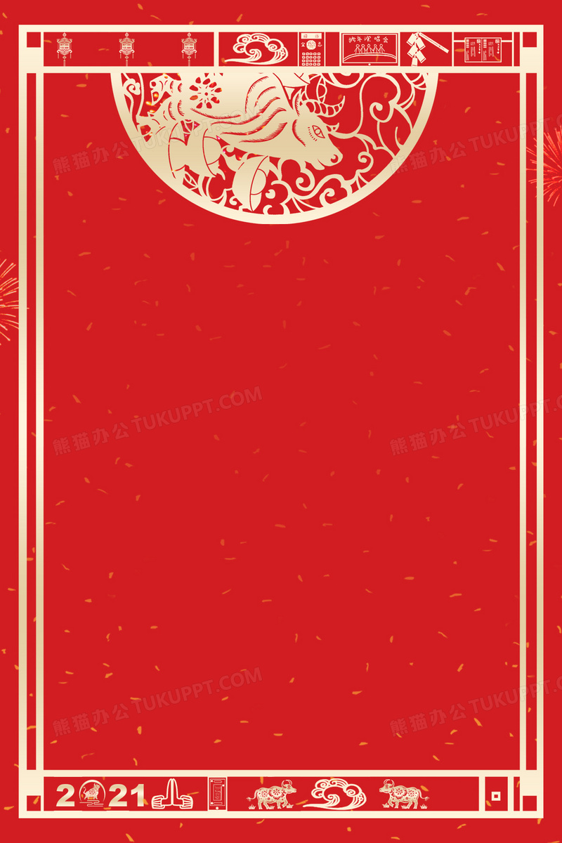 本作品内容为创意红色牛年春节剪纸背景, 格式为 psd, 大小16 MB, 图片尺寸为1181 x 1772, 作品中背景图片无需修改, 源文件无水印,可以直接使用, 欢迎使用熊猫办公。 如认为平台内容涉嫌侵权,可通过邮件:tousu@tukuppt.com提出书面通知,我们将及时处理。