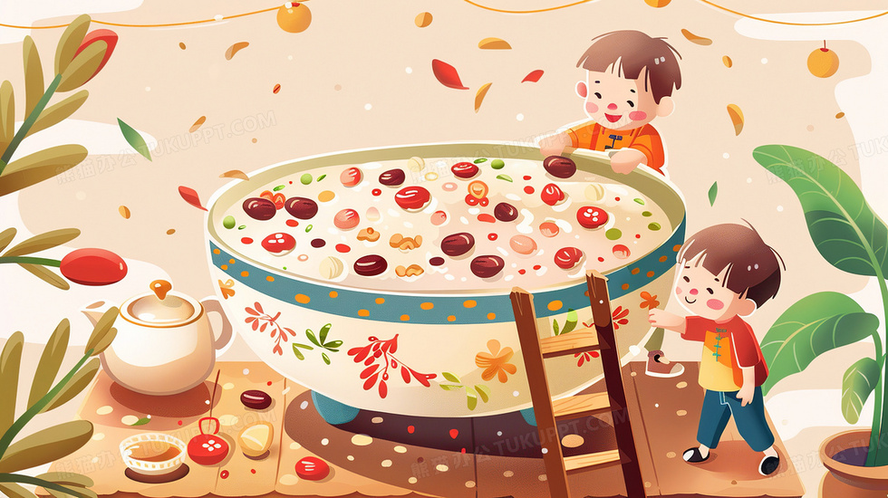 本作品内容为一大碗腊八粥旁边有两个小朋友卡通插画, 格式为 jpg, 大小3 MB, 图片尺寸为2912 x 1632, 源文件无水印, 欢迎使用熊猫办公。 如认为平台内容涉嫌侵权,可通过邮件:tousu@tukuppt.com提出书面通知,我们将及时处理。