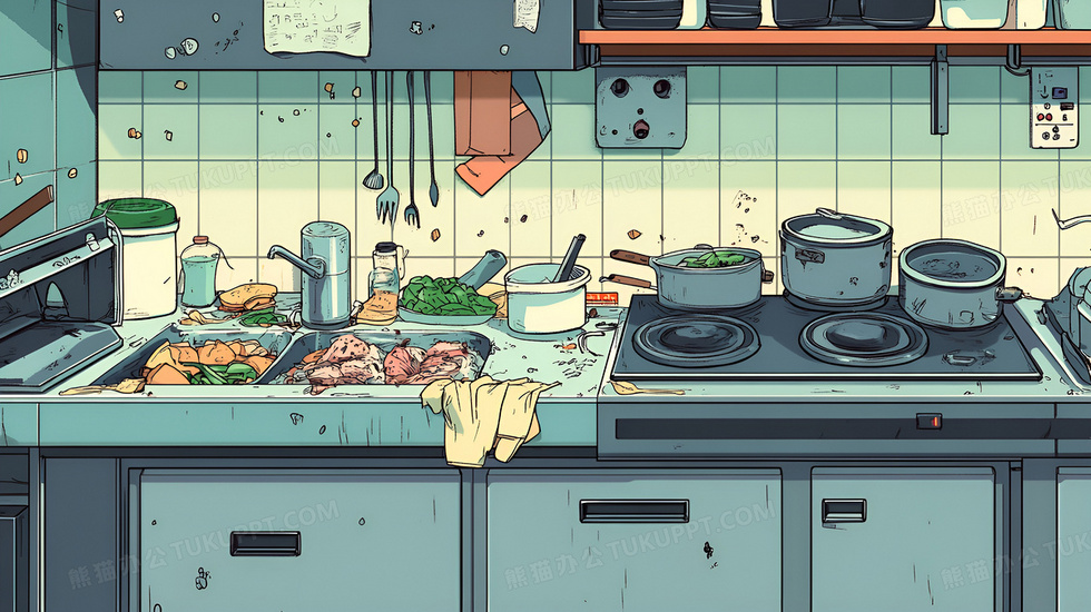本作品内容为邋遢的后厨场景插画, 格式为 jpg, 大小2 MB, 图片尺寸为2912 x 1632, 源文件无水印, 欢迎使用熊猫办公。 如认为平台内容涉嫌侵权,可通过邮件:tousu@tukuppt.com提出书面通知,我们将及时处理。