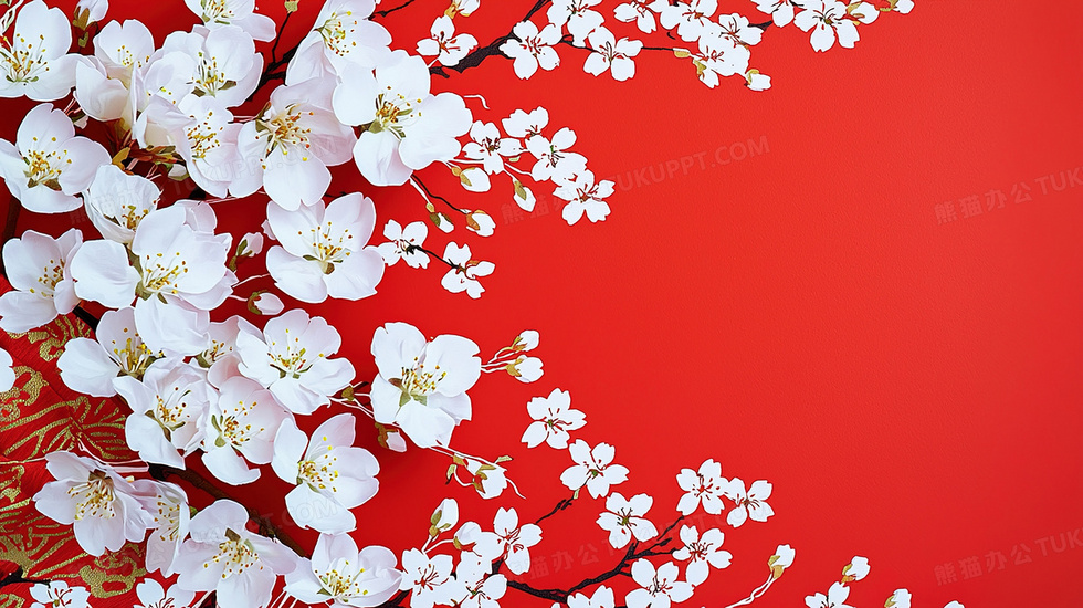 本作品内容为白色植物花卉红色背景, 格式为 jpg, 大小3 MB, 图片尺寸为2912 x 1632, 作品中背景图片无需修改, 源文件无水印,可以直接使用, 欢迎使用熊猫办公。 如认为平台内容涉嫌侵权,可通过邮件:tousu@tukuppt.com提出书面通知,我们将及时处理。