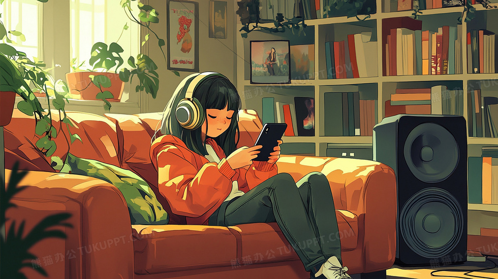 本作品内容为娱乐设施客厅沙发上坐着听音乐玩手机的女生插画, 格式为 jpg, 大小3 MB, 图片尺寸为2912 x 1632, 源文件无水印, 欢迎使用熊猫办公。 如认为平台内容涉嫌侵权,可通过邮件:tousu@tukuppt.com提出书面通知,我们将及时处理。