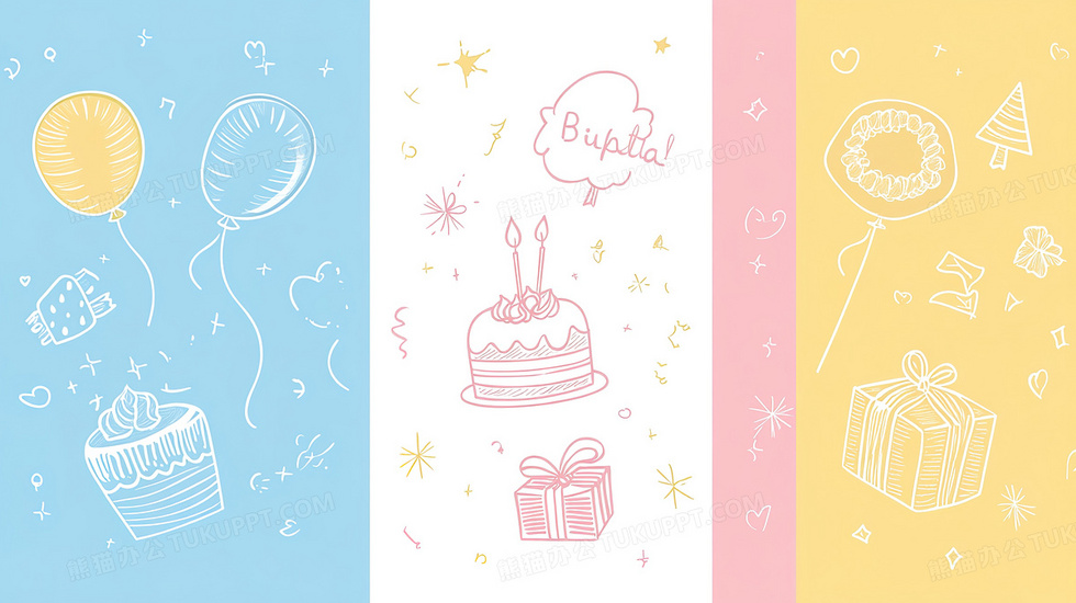 本作品内容为生日相关线稿背景, 格式为 jpg, 大小2 MB, 图片尺寸为2912 x 1632, 作品中背景图片无需修改, 源文件无水印,可以直接使用, 欢迎使用熊猫办公。 如认为平台内容涉嫌侵权,可通过邮件:tousu@tukuppt.com提出书面通知,我们将及时处理。