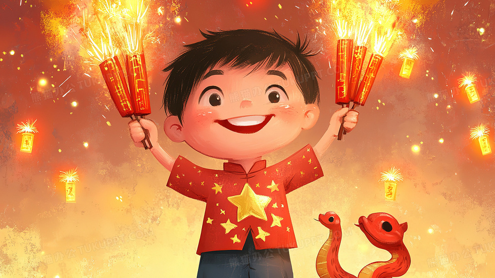 本作品内容为蛇年春节放炮竹卡通男孩与蛇插画, 格式为 jpg, 大小4 MB, 图片尺寸为2912 x 1632, 源文件无水印, 欢迎使用熊猫办公。 如认为平台内容涉嫌侵权,可通过邮件:tousu@tukuppt.com提出书面通知,我们将及时处理。