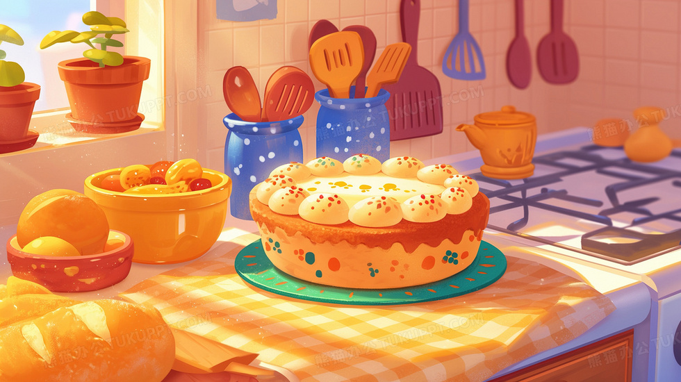 本作品内容为厨房西式甜点美食生日蛋糕插画, 格式为 jpg, 大小3 MB, 图片尺寸为2912 x 1632, 源文件无水印, 欢迎使用熊猫办公。 如认为平台内容涉嫌侵权,可通过邮件:tousu@tukuppt.com提出书面通知,我们将及时处理。