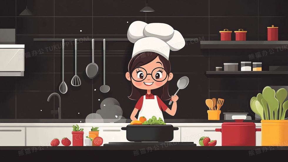 本作品内容为黑色卡通风做饭烹饪的女厨师插画, 格式为 jpg, 大小2 MB, 图片尺寸为2912 x 1632, 源文件无水印, 欢迎使用熊猫办公。 如认为平台内容涉嫌侵权,可通过邮件:tousu@tukuppt.com提出书面通知,我们将及时处理。