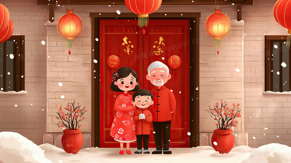 本作品内容为红色喜庆春节过年走亲戚的一家人插画, 格式为 jpg, 大小4 MB, 图片尺寸为2912 x 1632, 源文件无水印, 欢迎使用熊猫办公。 如认为平台内容涉嫌侵权,可通过邮件:tousu@tukuppt.com提出书面通知,我们将及时处理。