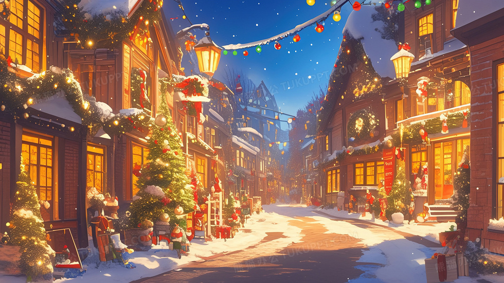 本作品内容为圣诞节冬天夜景街道装饰氛围唯美插画, 格式为 jpg, 大小3 MB, 图片尺寸为2912 x 1632, 源文件无水印, 欢迎使用熊猫办公。 如认为平台内容涉嫌侵权,可通过邮件:tousu@tukuppt.com提出书面通知,我们将及时处理。