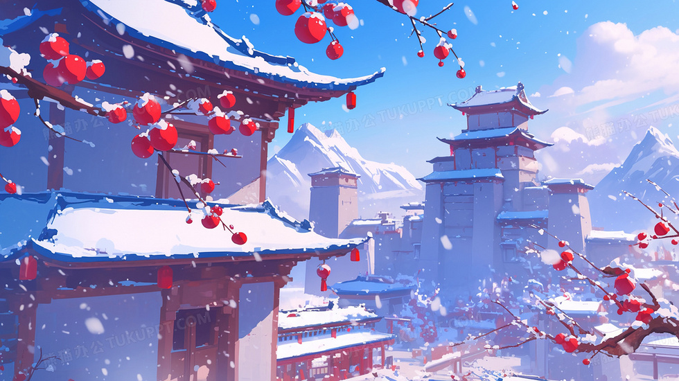 本作品内容为寒冷冬季飘落雪花古城建筑果实插画, 格式为 jpg, 大小3 MB, 图片尺寸为2912 x 1632, 源文件无水印, 欢迎使用熊猫办公。 如认为平台内容涉嫌侵权,可通过邮件:tousu@tukuppt.com提出书面通知,我们将及时处理。