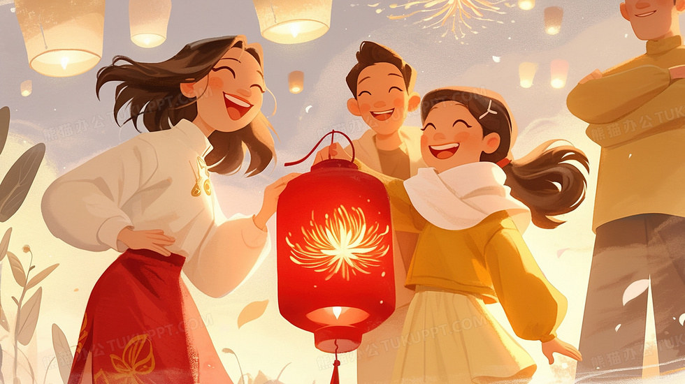 本作品内容为元宵集市看灯会开心一家人温馨插画, 格式为 jpg, 大小3 MB, 图片尺寸为2912 x 1632, 源文件无水印, 欢迎使用熊猫办公。 如认为平台内容涉嫌侵权,可通过邮件:tousu@tukuppt.com提出书面通知,我们将及时处理。