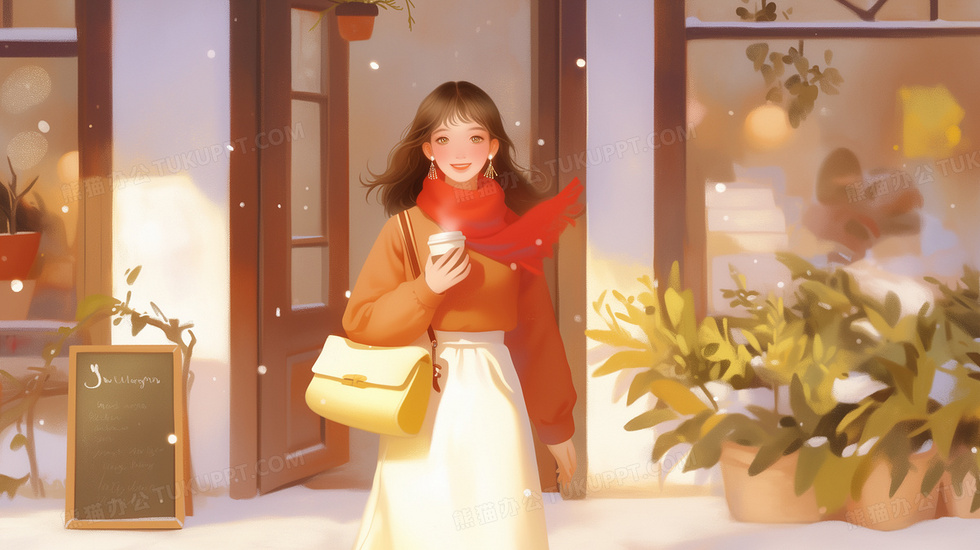本作品内容为女孩手拿热乎乎的咖啡走出咖啡屋插画, 格式为 jpg, 大小7 MB, 图片尺寸为2912 x 1632, 源文件无水印, 欢迎使用熊猫办公。 如认为平台内容涉嫌侵权,可通过邮件:tousu@tukuppt.com提出书面通知,我们将及时处理。