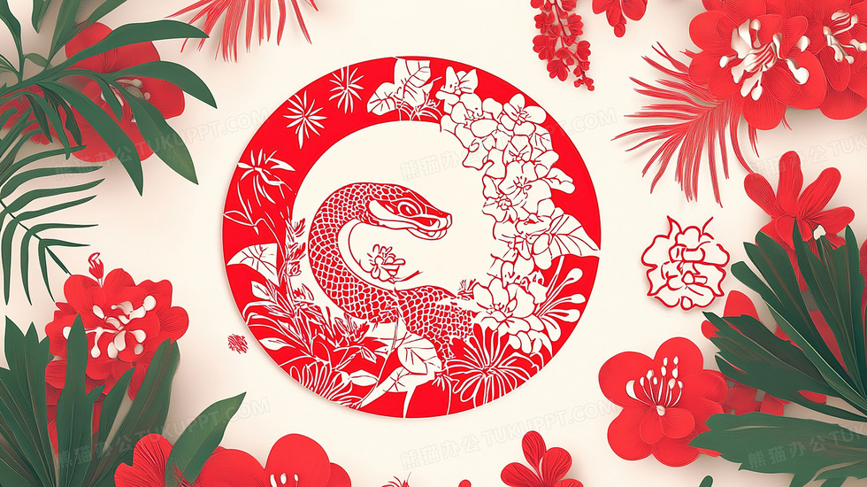 本作品内容为剪纸风红色植物花卉窗花蛇插画, 格式为 jpg, 大小4 MB, 图片尺寸为2912 x 1632, 源文件无水印, 欢迎使用熊猫办公。 如认为平台内容涉嫌侵权,可通过邮件:tousu@tukuppt.com提出书面通知,我们将及时处理。