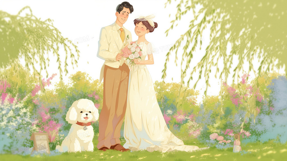 本作品内容为草地新婚幸福夫妻和宠物狗插画, 格式为 jpg, 大小3 MB, 图片尺寸为2912 x 1632, 源文件无水印, 欢迎使用熊猫办公。 如认为平台内容涉嫌侵权,可通过邮件:tousu@tukuppt.com提出书面通知,我们将及时处理。