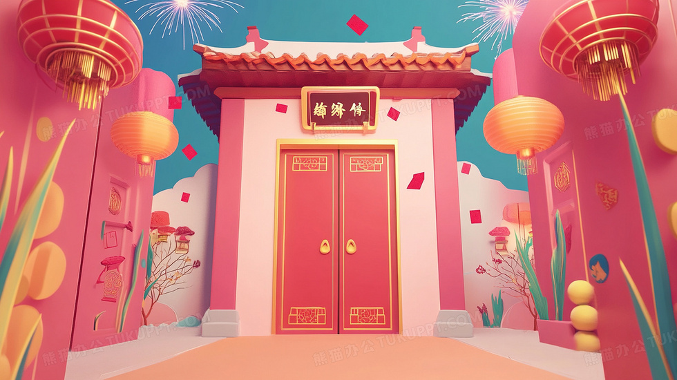 本作品内容为开门红大门春节新年插画, 格式为 jpg, 大小3 MB, 图片尺寸为2912 x 1632, 源文件无水印, 欢迎使用熊猫办公。 如认为平台内容涉嫌侵权,可通过邮件:tousu@tukuppt.com提出书面通知,我们将及时处理。