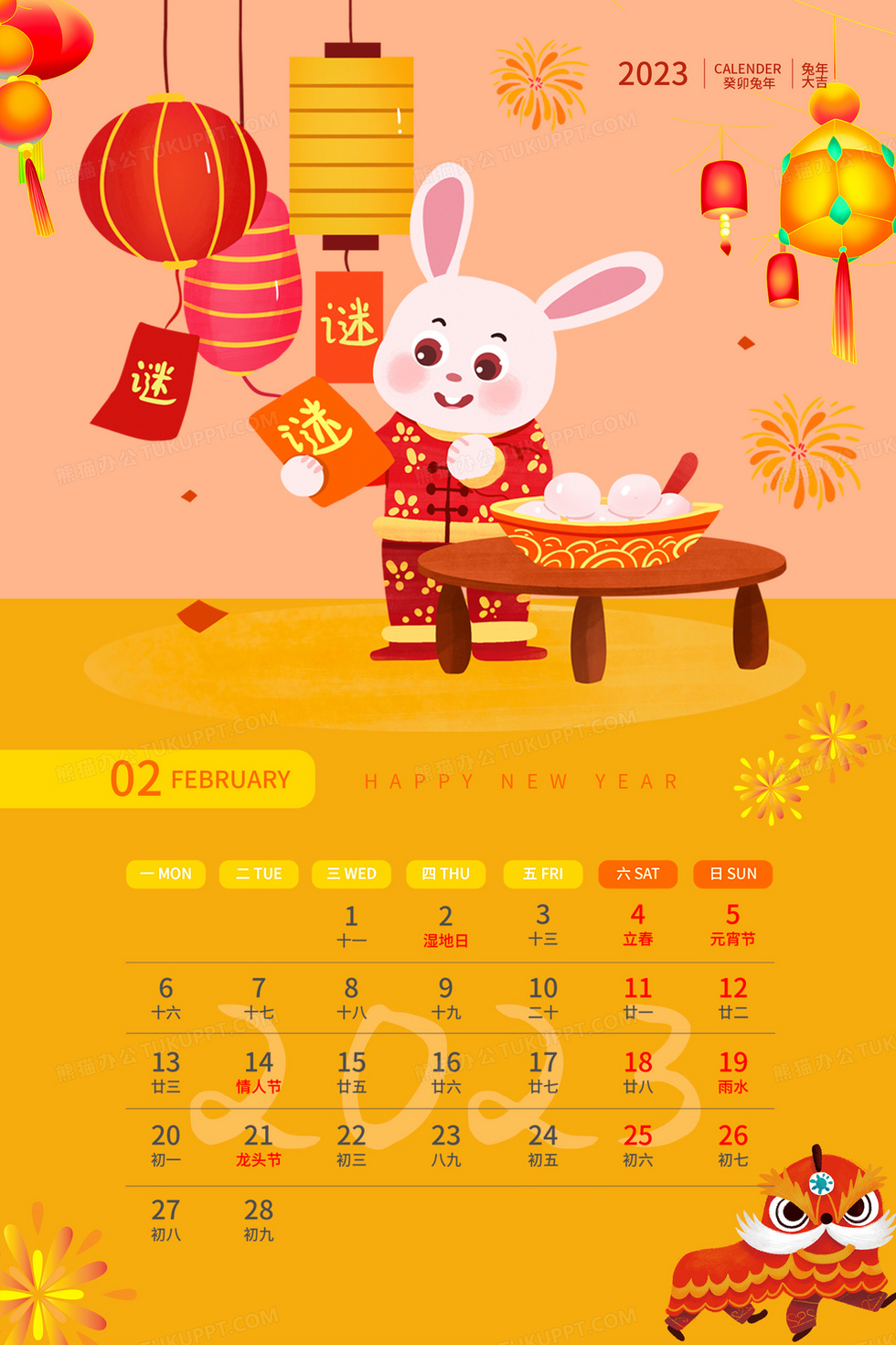 本作品内容为兔年卡通2月可爱日历, 格式为 psd, 大小16 MB, 图片尺寸为2362 x 3543, 作品中背景图片无需修改, 源文件无水印,可以直接使用, 欢迎使用熊猫办公。 如认为平台内容涉嫌侵权,可通过邮件:tousu@tukuppt.com提出书面通知,我们将及时处理。