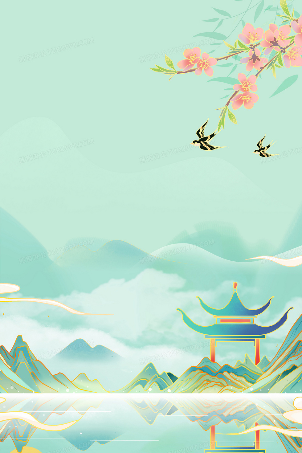 本作品内容为国潮绿色山水春天来了背景, 格式为 psd, 大小40 MB, 图片尺寸为3543 x 5315, 作品中背景图片无需修改, 源文件无水印,可以直接使用, 欢迎使用熊猫办公。 如认为平台内容涉嫌侵权,可通过邮件:tousu@tukuppt.com提出书面通知,我们将及时处理。