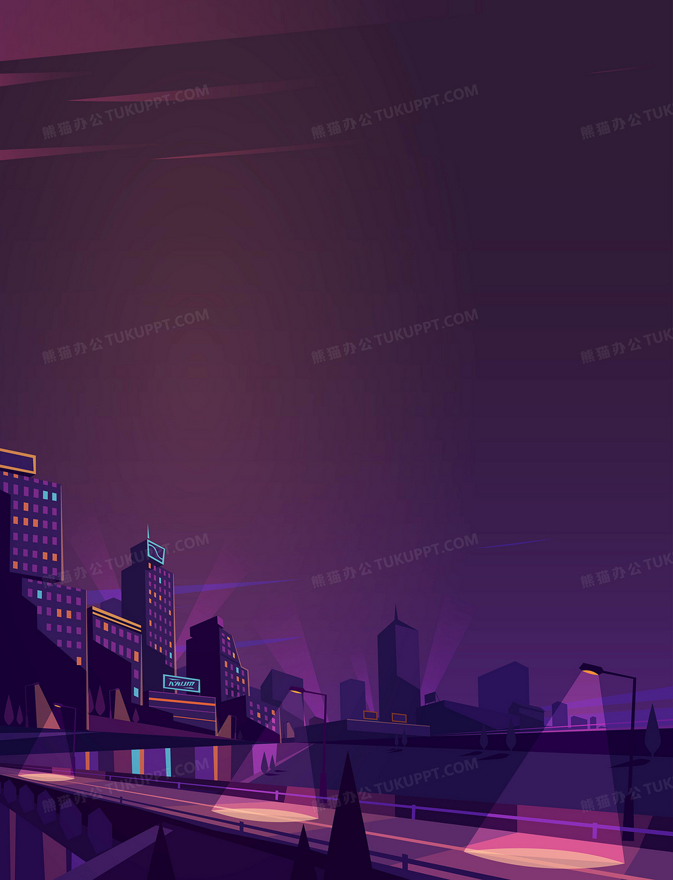 本作品内容为矢量紫色扁平化夜景城市背景, 格式为 ai, 图片尺寸为5330 x 6965, 作品中背景图片无需修改, 源文件无水印,可以直接使用, 欢迎使用熊猫办公。 如认为平台内容涉嫌侵权,可通过邮件:tousu@tukuppt.com提出书面通知,我们将及时处理。