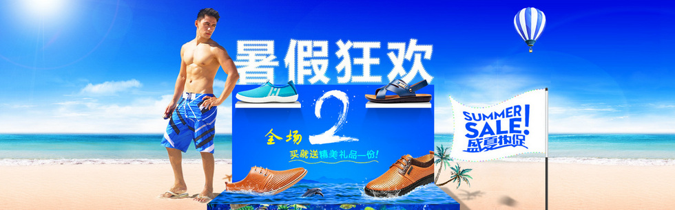 本作品内容为淘宝男鞋暑假狂欢, 格式为 psd, 图片尺寸为1920 x 600, 作品中背景图片无需修改, 源文件无水印,可以直接使用, 欢迎使用熊猫办公。 如认为平台内容涉嫌侵权,可通过邮件:tousu@tukuppt.com提出书面通知,我们将及时处理。
