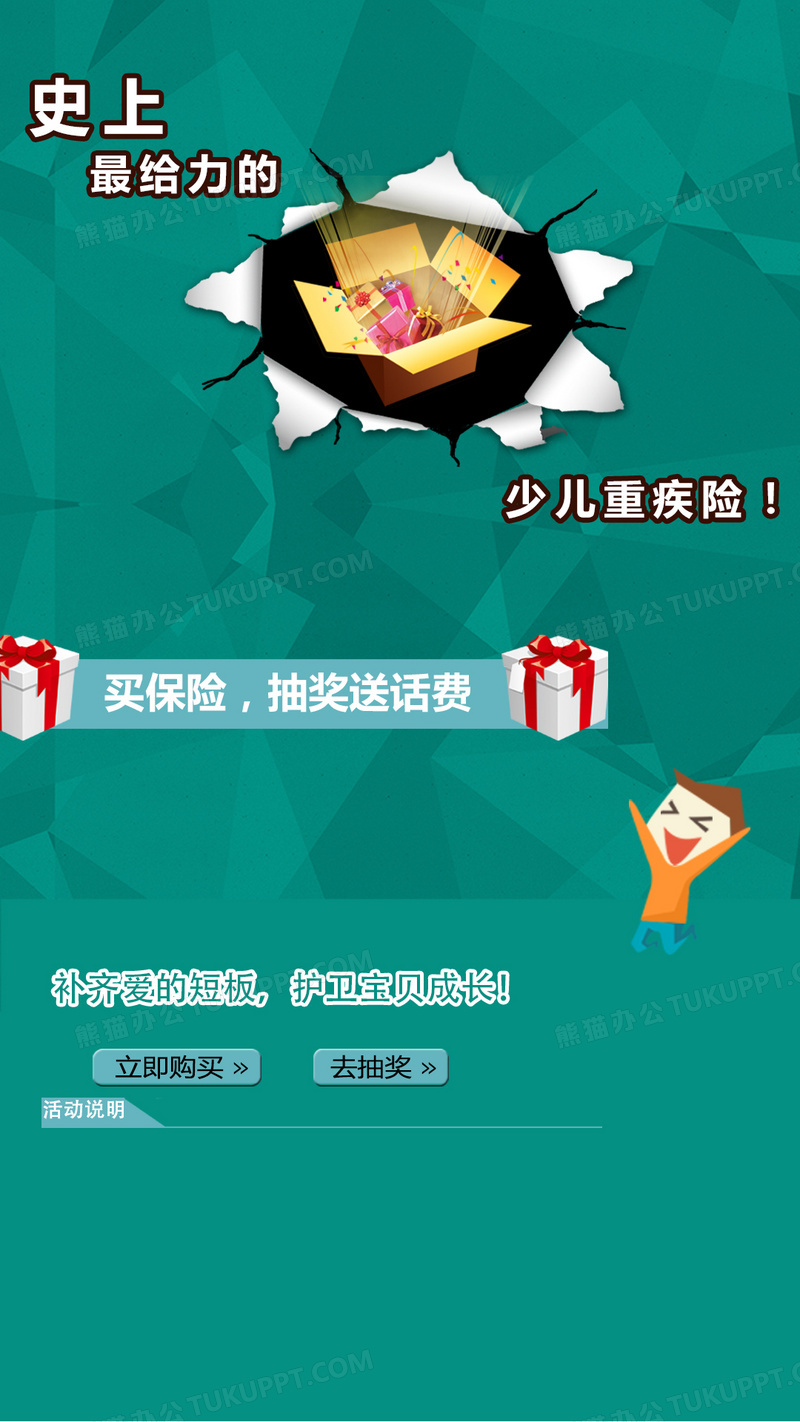 本作品内容为保险儿童险H5, 格式为 psd, 图片尺寸为1080 x 1920, 作品中背景图片无需修改, 源文件无水印,可以直接使用, 欢迎使用熊猫办公。 如认为平台内容涉嫌侵权,可通过邮件:tousu@tukuppt.com提出书面通知,我们将及时处理。