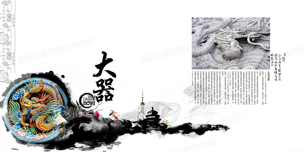 本作品内容为中国风大器水墨画册, 格式为 psd, 图片尺寸为6614 x 3307, 作品中背景图片无需修改, 源文件无水印,可以直接使用, 欢迎使用熊猫办公。 如认为平台内容涉嫌侵权,可通过邮件:tousu@tukuppt.com提出书面通知,我们将及时处理。