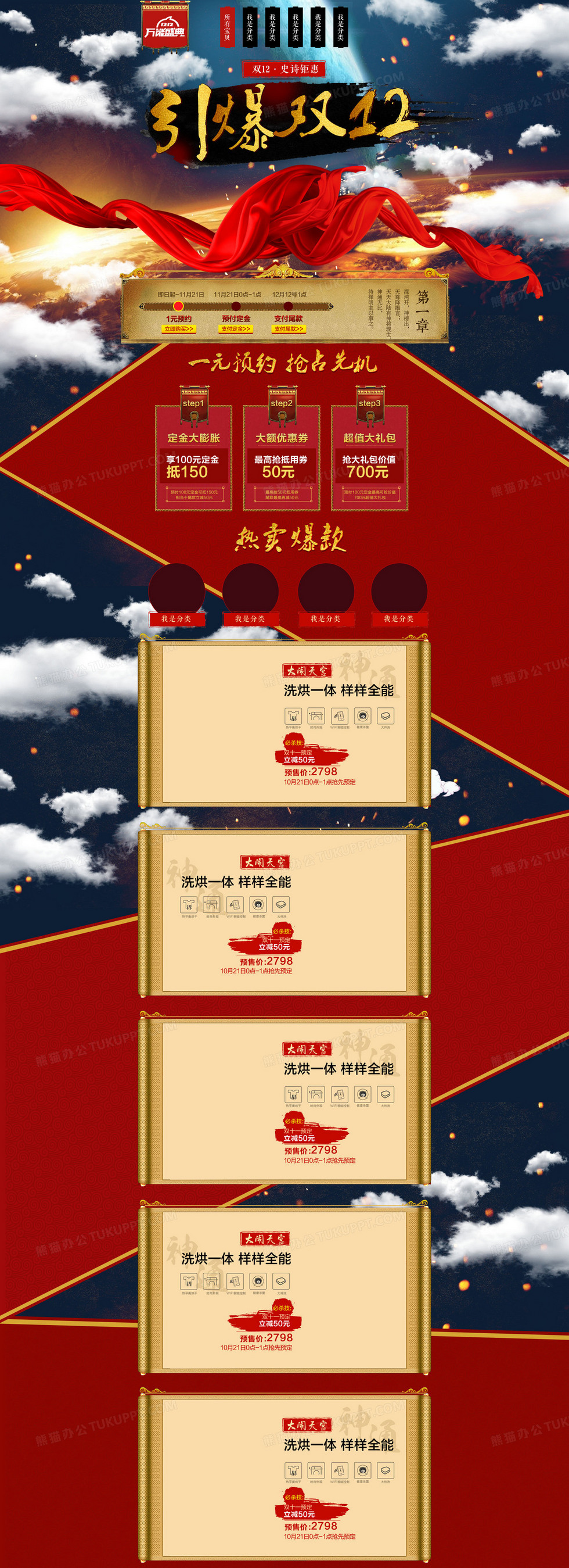 本作品内容为双十一首页背景模板, 格式为 psd, 图片尺寸为1920 x 5287, 作品中背景图片无需修改, 源文件无水印,可以直接使用, 欢迎使用熊猫办公。 如认为平台内容涉嫌侵权,可通过邮件:tousu@tukuppt.com提出书面通知,我们将及时处理。