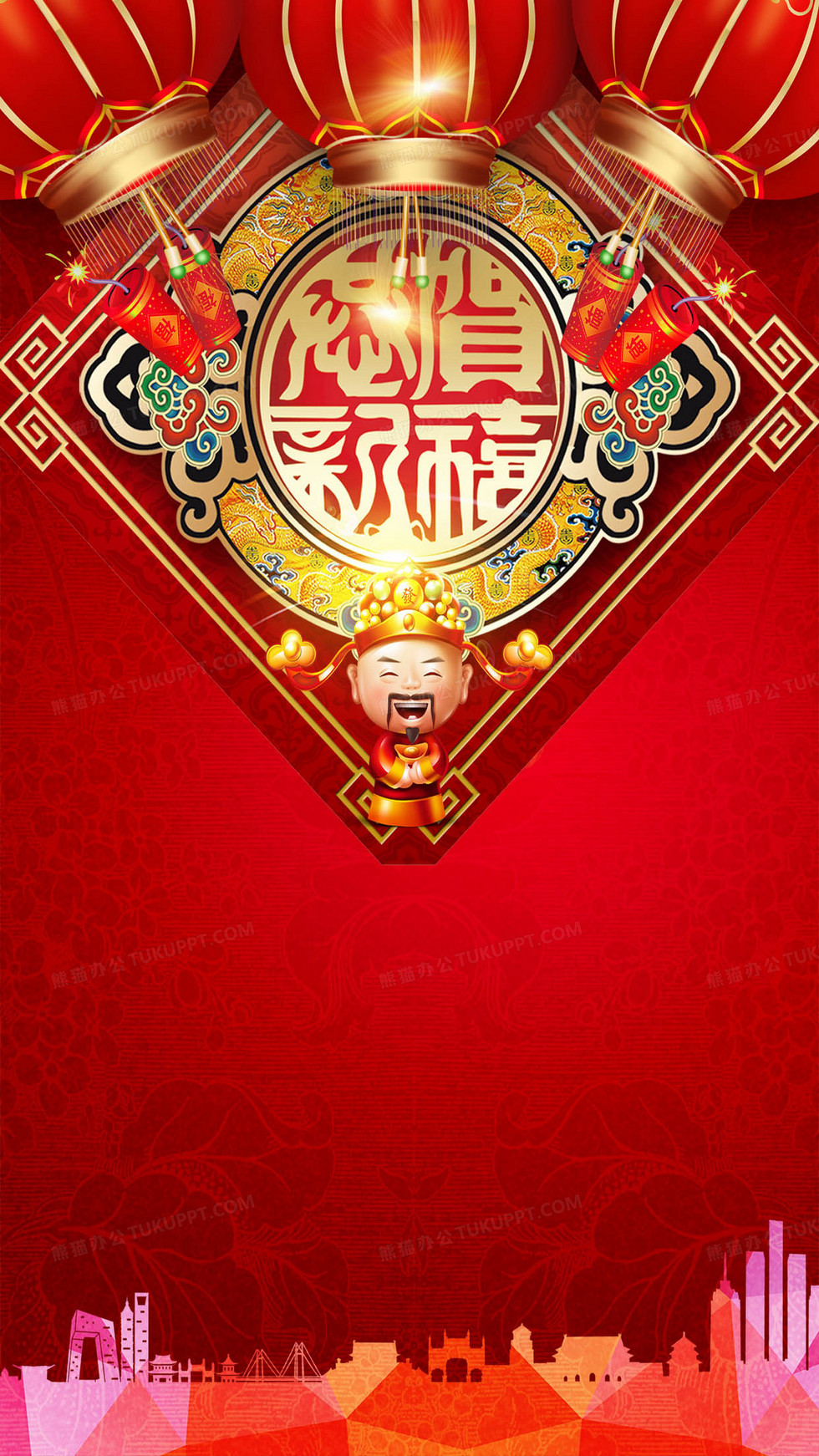 本作品内容为喜庆财神拜年H5背景, 格式为 psd, 图片尺寸为1242 x 2208, 作品中背景图片无需修改, 源文件无水印,可以直接使用, 欢迎使用熊猫办公。 如认为平台内容涉嫌侵权,可通过邮件:tousu@tukuppt.com提出书面通知,我们将及时处理。
