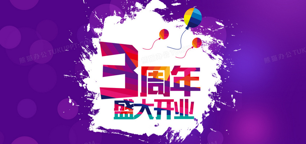 本作品内容为3周年盛大开业背景图, 格式为 jpg, 图片尺寸为1920 x 900, 作品中背景图片无需修改, 源文件无水印,可以直接使用, 欢迎使用熊猫办公。 如认为平台内容涉嫌侵权,可通过邮件:tousu@tukuppt.com提出书面通知,我们将及时处理。