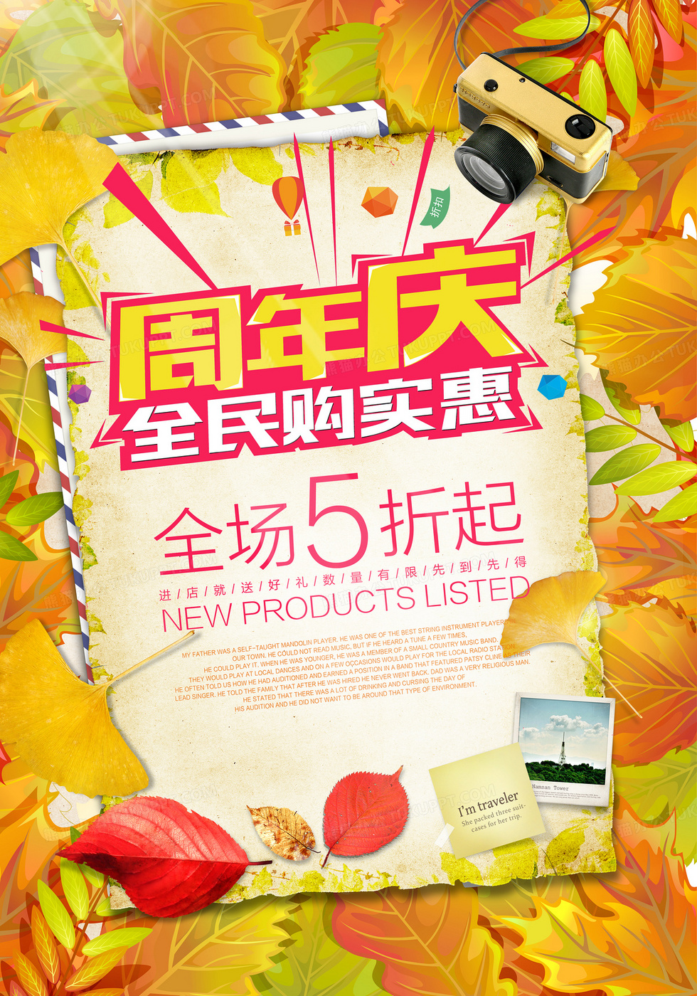 本作品内容为黄色树叶周年庆活动海报, 格式为 psd, 图片尺寸为3500 x 5000, 作品中背景图片无需修改, 源文件无水印,可以直接使用, 欢迎使用熊猫办公。 如认为平台内容涉嫌侵权,可通过邮件:tousu@tukuppt.com提出书面通知,我们将及时处理。