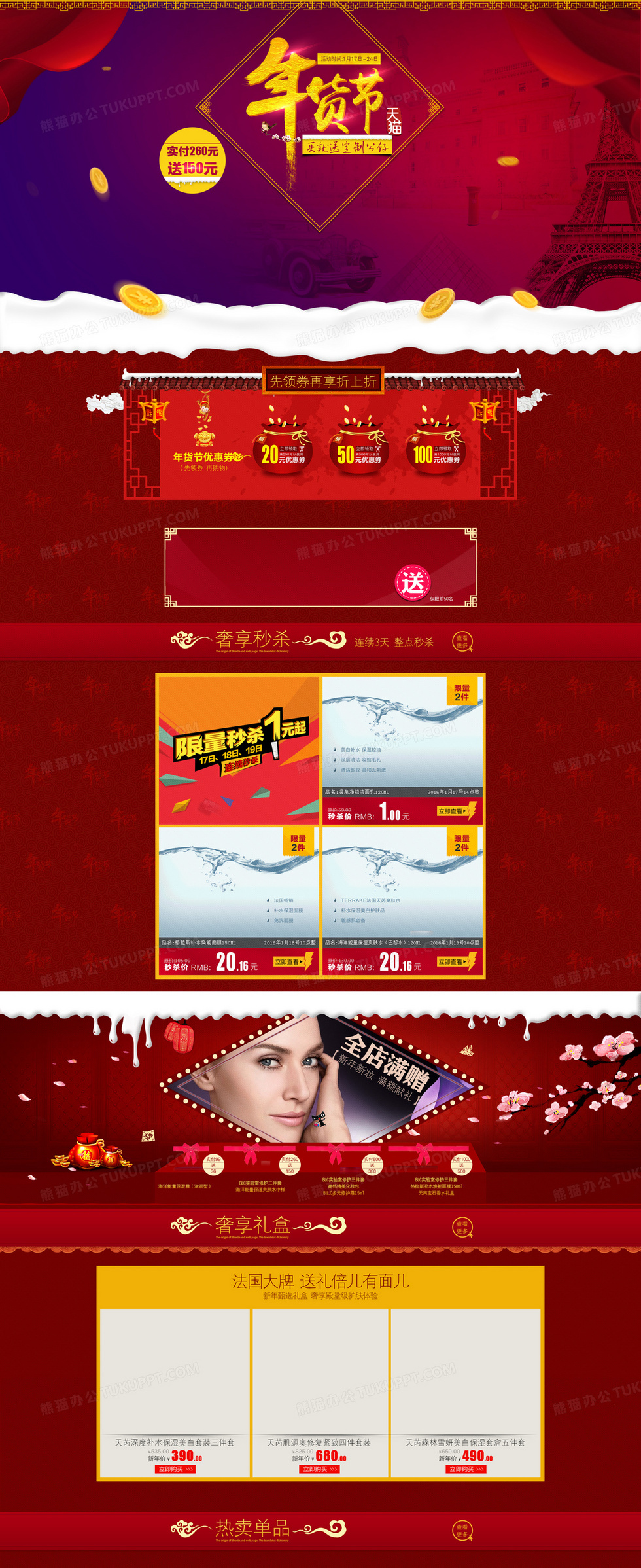 本作品内容为红色狂欢天猫年货节首页背景, 格式为 psd, 图片尺寸为1920 x 4695, 作品中背景图片无需修改, 源文件无水印,可以直接使用, 欢迎使用熊猫办公。 如认为平台内容涉嫌侵权,可通过邮件:tousu@tukuppt.com提出书面通知,我们将及时处理。