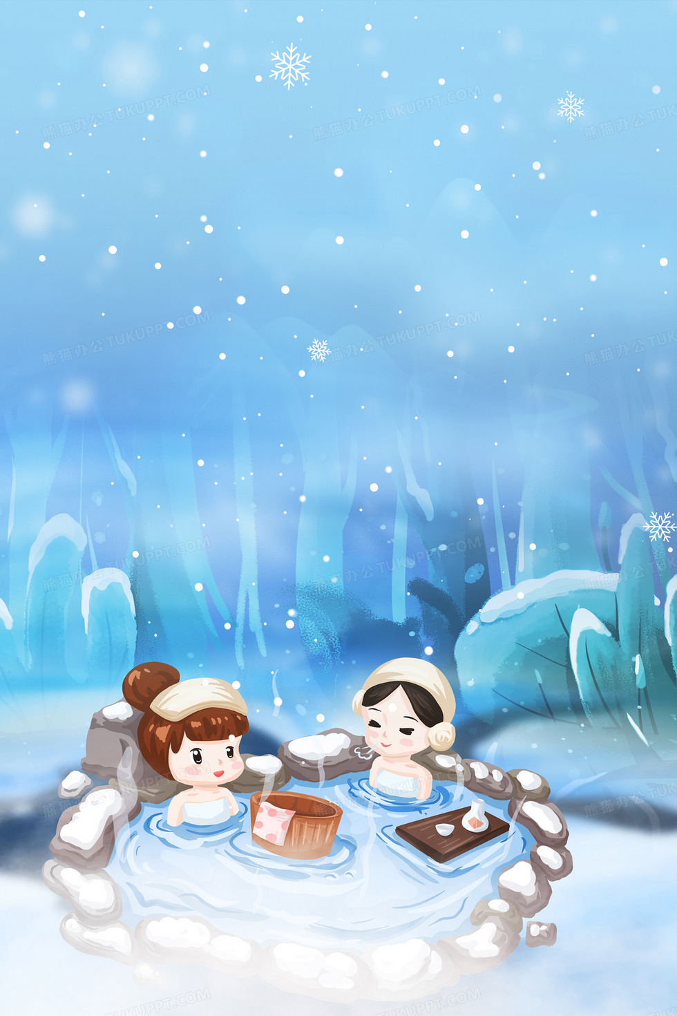本作品内容为冬日养生森林温泉背景, 格式为 psd, 大小153 MB, 图片尺寸为3543 x 5314, 作品中背景图片无需修改, 源文件无水印,可以直接使用, 欢迎使用熊猫办公。 如认为平台内容涉嫌侵权,可通过邮件:tousu@tukuppt.com提出书面通知,我们将及时处理。