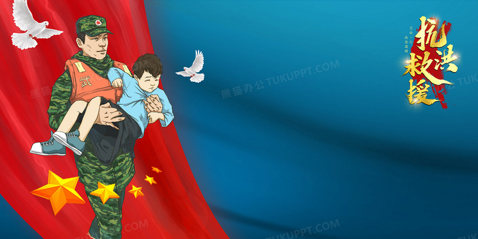 本作品内容为抗洪救灾第一线抢险主题正能量广告背景, 格式为 psd, 大小18 MB, 图片尺寸为4724 x 2362, 作品中背景图片无需修改, 源文件无水印,可以直接使用, 欢迎使用熊猫办公。 如认为平台内容涉嫌侵权,可通过邮件:tousu@tukuppt.com提出书面通知,我们将及时处理。