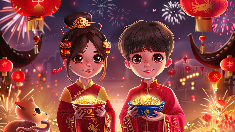 本作品内容为春节抱金币的卡通男孩女孩烟花插画, 格式为 jpg, 大小3 MB, 图片尺寸为2912 x 1632, 源文件无水印, 欢迎使用熊猫办公。 如认为平台内容涉嫌侵权,可通过邮件:tousu@tukuppt.com提出书面通知,我们将及时处理。