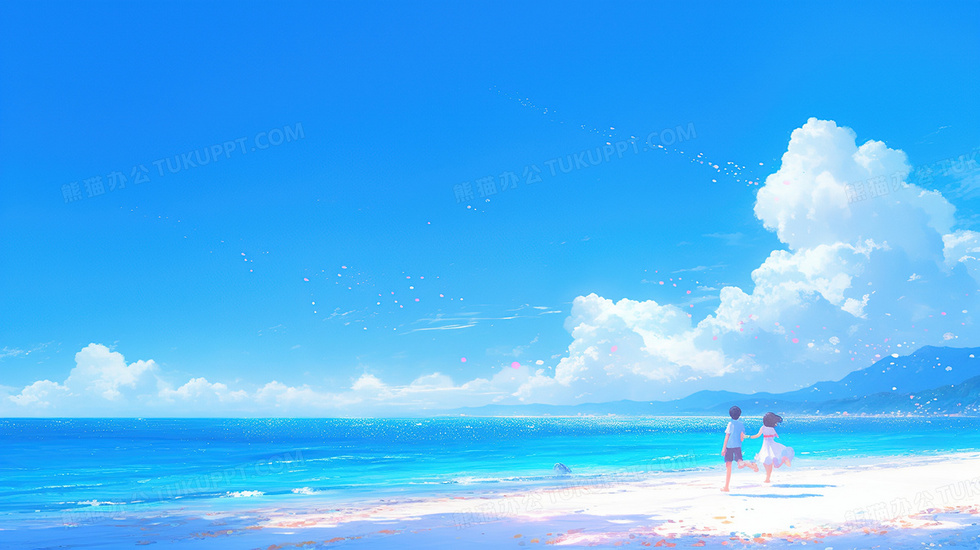 本作品内容为卡通蓝天白云女孩男孩海边散步插画, 格式为 jpg, 大小4 MB, 图片尺寸为2912 x 1632, 源文件无水印, 欢迎使用熊猫办公。 如认为平台内容涉嫌侵权,可通过邮件:tousu@tukuppt.com提出书面通知,我们将及时处理。