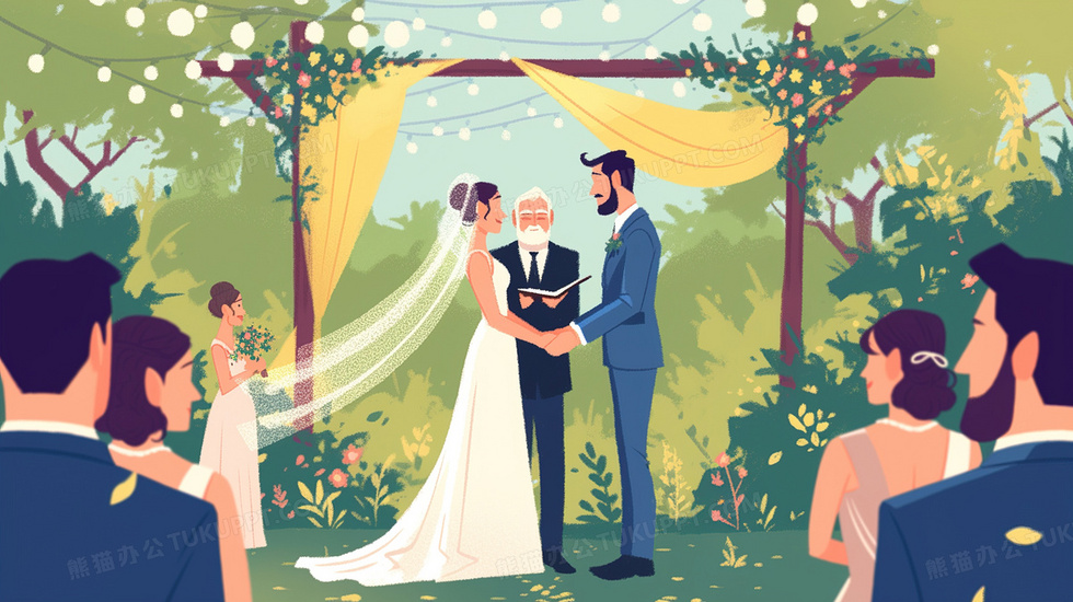 本作品内容为婚礼现场主婚人向一对新人致辞场景插画, 格式为 jpg, 大小3 MB, 图片尺寸为2912 x 1632, 源文件无水印, 欢迎使用熊猫办公。 如认为平台内容涉嫌侵权,可通过邮件:tousu@tukuppt.com提出书面通知,我们将及时处理。