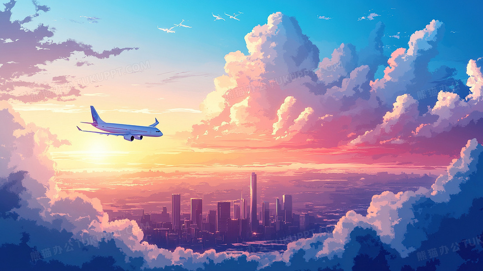 本作品内容为城市上空飞翔的客机飞机插画, 格式为 jpg, 大小3 MB, 图片尺寸为2912 x 1632, 源文件无水印, 欢迎使用熊猫办公。 如认为平台内容涉嫌侵权,可通过邮件:tousu@tukuppt.com提出书面通知,我们将及时处理。