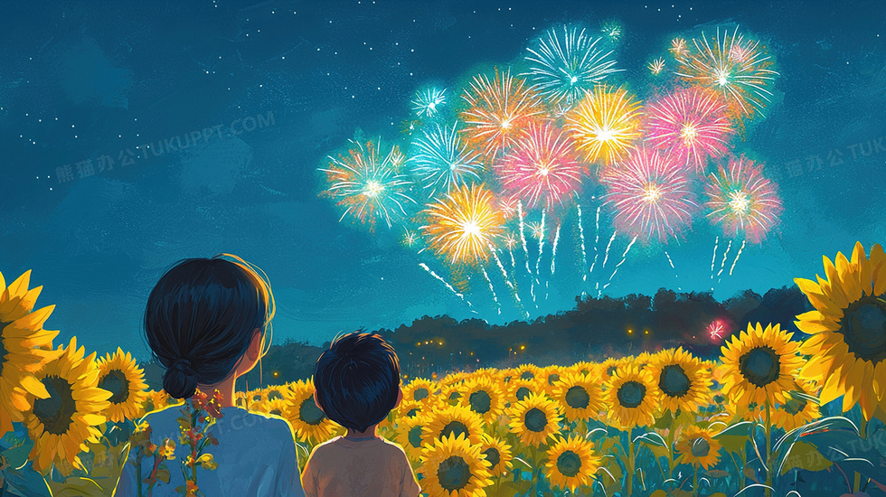 本作品内容为父母和孩子向日葵花海看璀璨烟花插画, 格式为 jpg, 大小4 MB, 图片尺寸为2912 x 1632, 源文件无水印, 欢迎使用熊猫办公。 如认为平台内容涉嫌侵权,可通过邮件:tousu@tukuppt.com提出书面通知,我们将及时处理。
