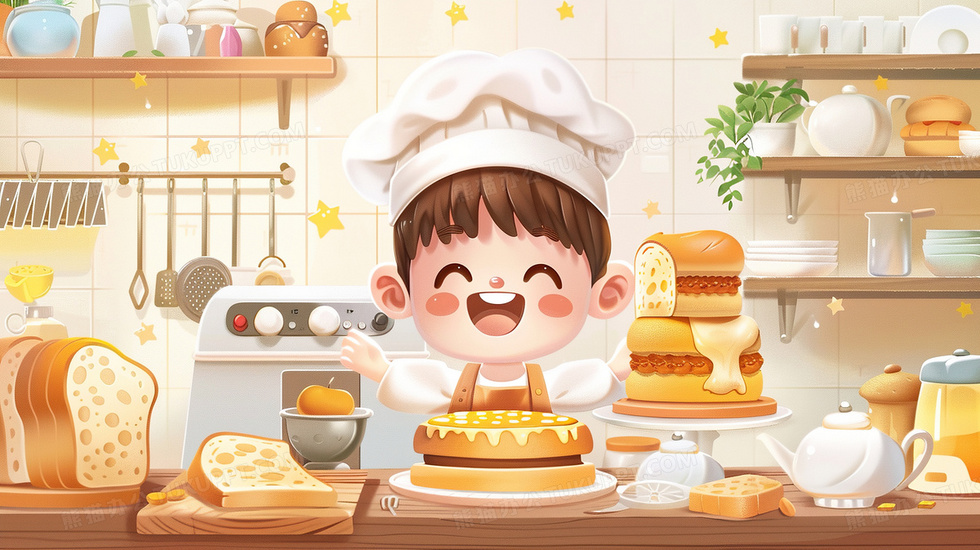 本作品内容为厨师烘焙美食面包蛋糕插画, 格式为 jpg, 大小3 MB, 图片尺寸为2912 x 1632, 源文件无水印, 欢迎使用熊猫办公。 如认为平台内容涉嫌侵权,可通过邮件:tousu@tukuppt.com提出书面通知,我们将及时处理。