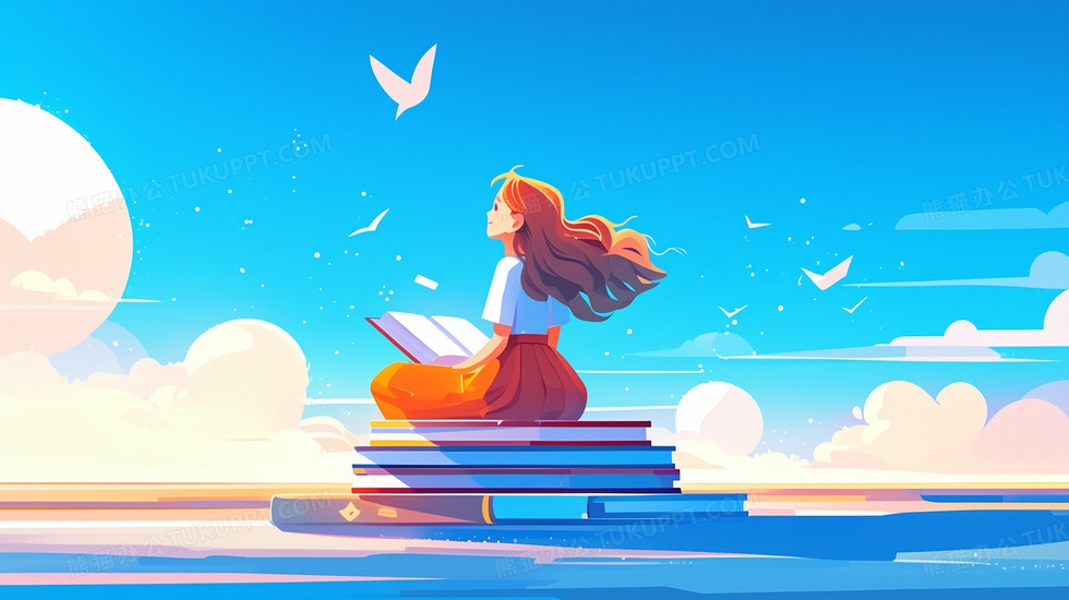 本作品内容为女孩坐在书本上看书创意教育插画, 格式为 jpg, 大小5 MB, 图片尺寸为2912 x 1632, 源文件无水印, 欢迎使用熊猫办公。 如认为平台内容涉嫌侵权,可通过邮件:tousu@tukuppt.com提出书面通知,我们将及时处理。