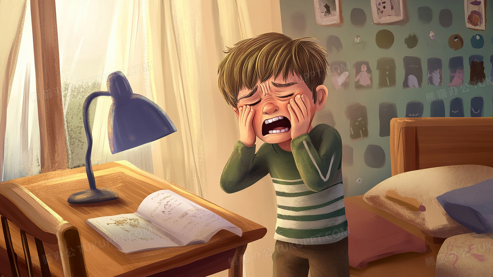 本作品内容为卧室内哭泣生气郁闷愤怒的男孩插画, 格式为 jpg, 大小3 MB, 图片尺寸为2912 x 1632, 源文件无水印, 欢迎使用熊猫办公。 如认为平台内容涉嫌侵权,可通过邮件:tousu@tukuppt.com提出书面通知,我们将及时处理。