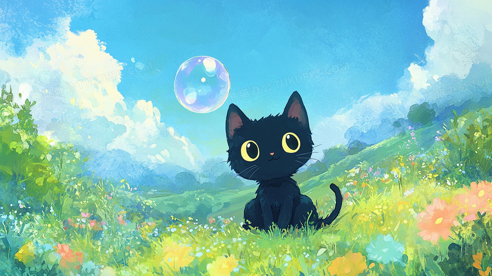 本作品内容为草地黑猫梦幻治愈唯美风景插画, 格式为 jpg, 大小4 MB, 图片尺寸为2912 x 1632, 源文件无水印, 欢迎使用熊猫办公。 如认为平台内容涉嫌侵权,可通过邮件:tousu@tukuppt.com提出书面通知,我们将及时处理。