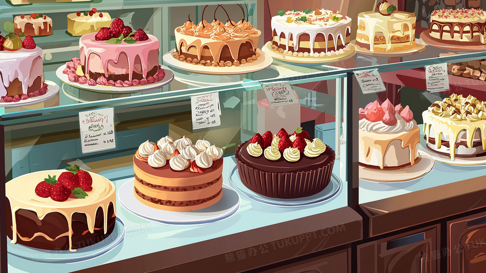 本作品内容为橱窗展示各式各样的蛋糕插画, 格式为 jpg, 大小3 MB, 图片尺寸为2912 x 1632, 源文件无水印, 欢迎使用熊猫办公。 如认为平台内容涉嫌侵权,可通过邮件:tousu@tukuppt.com提出书面通知,我们将及时处理。