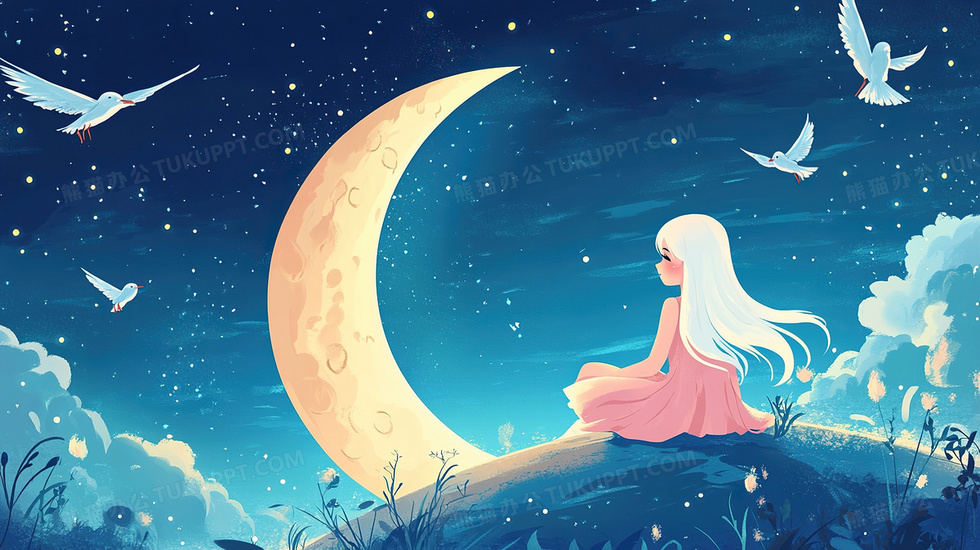 本作品内容为在月亮下的女孩治愈插画, 格式为 jpg, 大小4 MB, 图片尺寸为2912 x 1632, 源文件无水印, 欢迎使用熊猫办公。 如认为平台内容涉嫌侵权,可通过邮件:tousu@tukuppt.com提出书面通知,我们将及时处理。