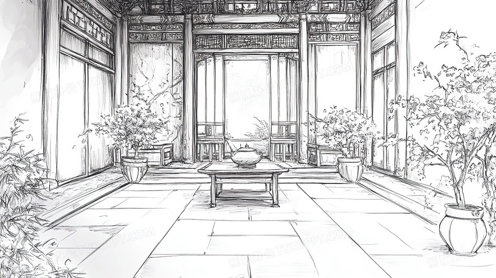 本作品内容为古典家居装修设计客厅手绘素描线稿插画, 格式为 jpg, 大小4 MB, 图片尺寸为2912 x 1632, 源文件无水印, 欢迎使用熊猫办公。 如认为平台内容涉嫌侵权,可通过邮件:tousu@tukuppt.com提出书面通知,我们将及时处理。