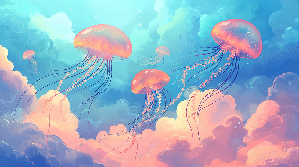 本作品内容为治愈系列奇妙梦幻空中飞翔的水母插画, 格式为 jpg, 大小3 MB, 图片尺寸为2912 x 1632, 源文件无水印, 欢迎使用熊猫办公。 如认为平台内容涉嫌侵权,可通过邮件:tousu@tukuppt.com提出书面通知,我们将及时处理。