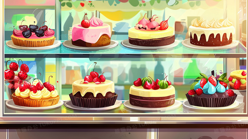 本作品内容为橱窗展示各式各样的蛋糕插画, 格式为 jpg, 大小3 MB, 图片尺寸为2912 x 1632, 源文件无水印, 欢迎使用熊猫办公。 如认为平台内容涉嫌侵权,可通过邮件:tousu@tukuppt.com提出书面通知,我们将及时处理。