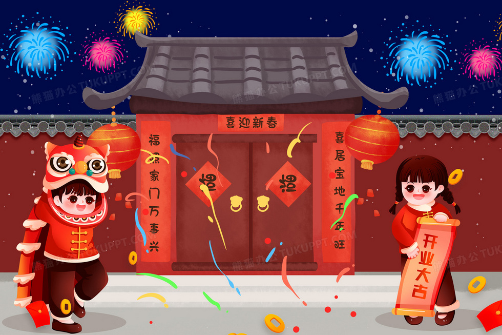 本作品内容为新年两个小朋友在门口舞狮子插画, 格式为 psd, 大小50 MB, 请使用软件PhotoShop(CS6)打开, 源文件无水印, 欢迎使用熊猫办公。 如认为平台内容涉嫌侵权,可通过邮件:tousu@tukuppt.com提出书面通知,我们将及时处理。